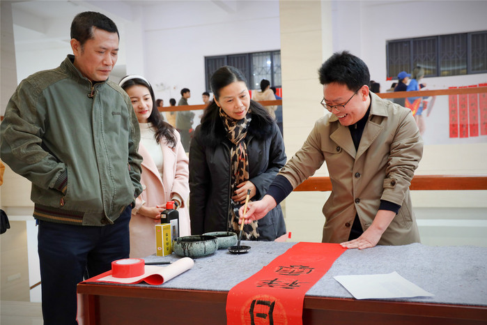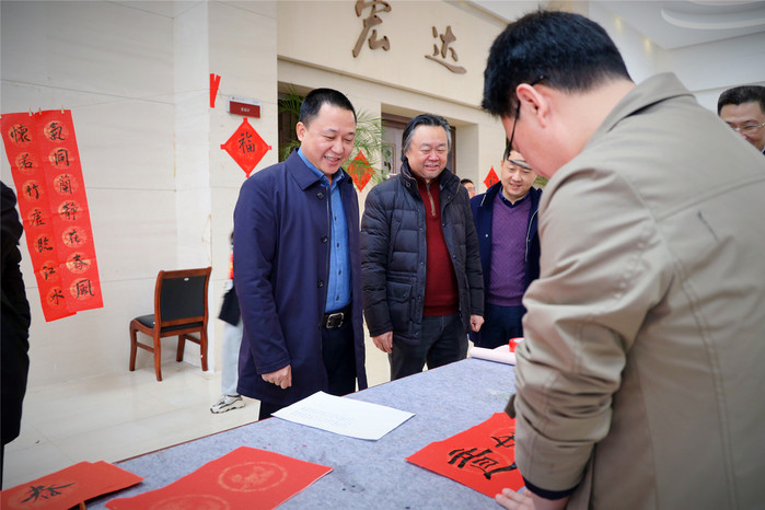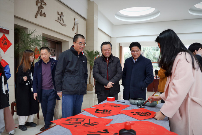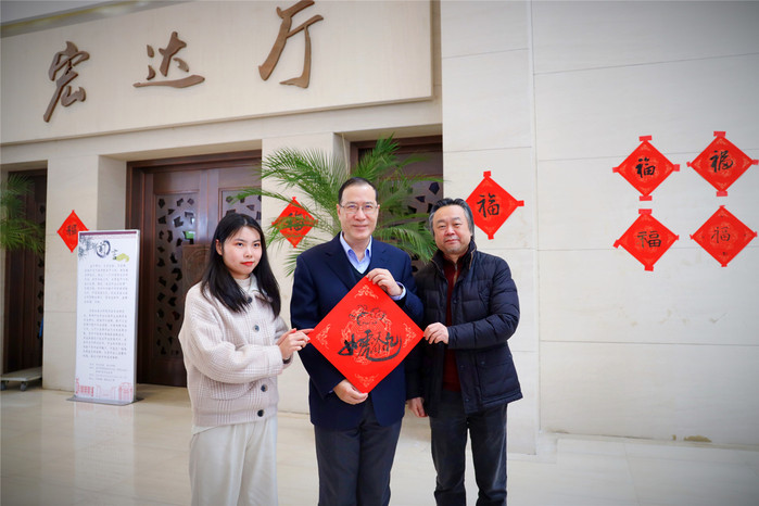 活动吸引了众多老师参与,现场其乐融融。大家驻足品赏、相互交流,挑选自己喜欢满意的书法作品,人人脸上洋溢着幸福笑容。活动期间,校领导王长平、陈晓红、郑家建、涂荣先后来到现场,与师生互送祝福。当天,师生共创作送出500多副春联和福文化创意作品。