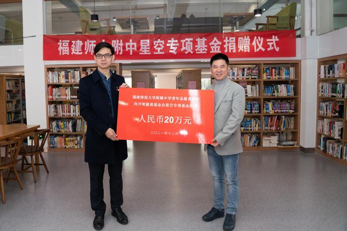 捐赠仪式上,附中团委书记陈志强作为代表,向开明慈善基金会“福建星空专项基金”捐赠人民币20万元。2021年是师大附中140周年校庆,团委学生会发动师生设计校庆文创产品并投入义卖,校庆义卖收入为本次捐赠善款的主要来源。