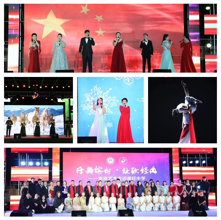 近日,音乐学院师生走进荣耀体育在线注册_荣耀体育(中国)附属福清德旺中学,亮相该校2022年元旦迎新晚会暨第九届校园文化艺术节。晚会以“乐舞缤纷,致敬经典”为主题,由歌曲联唱、笛子独奏《沂蒙山歌》、二胡齐奏《战马奔腾》、古筝三重奏《蹀马倾杯舞千秋》、女声四重唱《绒花》、群舞《星火燎原》《戈壁沙丘》、钢琴与双排键电子琴演奏《保卫黄河》等18个节目构成。节目精彩纷呈,获得师生热烈反响。(音乐学院)
