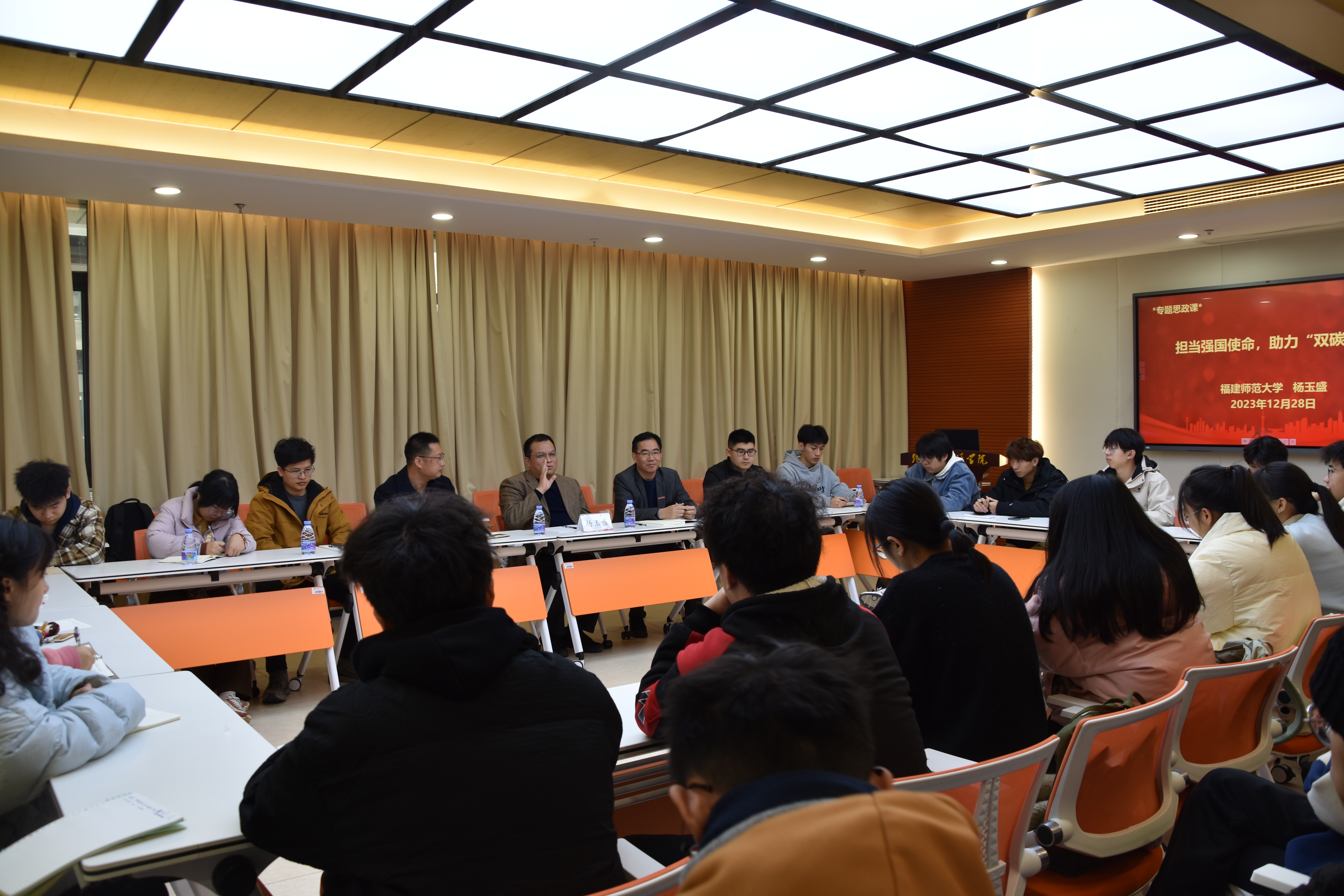 12月28日,副校长杨玉盛教授在旗山校区科技楼18号楼为物理与能源学院学生讲授题为“担当强国使命,助力‘双碳’发展”的专题思政课。学院相关负责人、辅导员、教师代表以及2021级储能科学与工程专业全体同学到场听课。