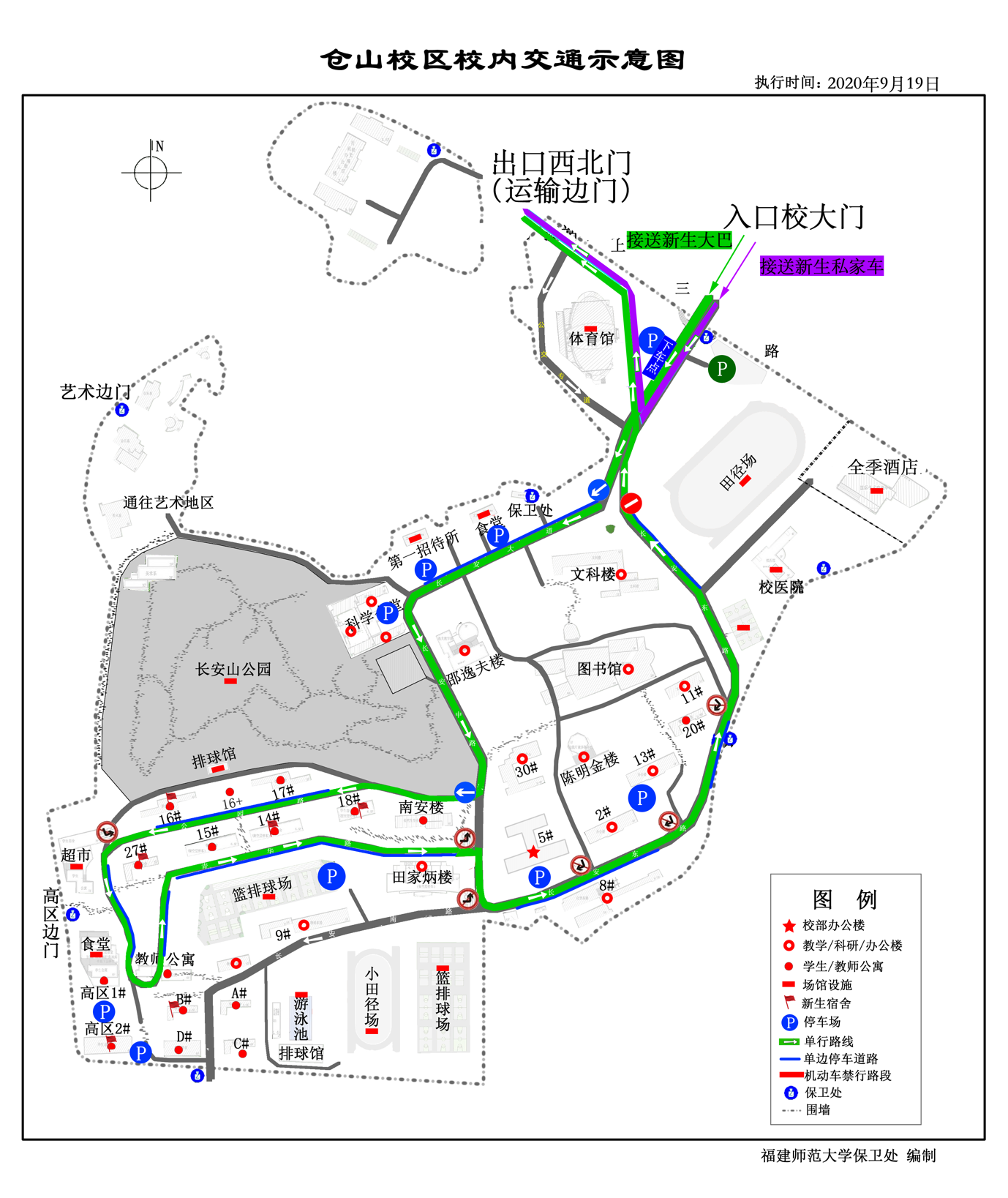 (一)迎新期间旗山校区开放东门、南门、星槎桥等通道,其中东门通道全天24小时开放,南门、星槎桥等通道开放时间为:7:00-22:30。东门通道可供师生和小型车辆通行,南门通道可供师生和接站大巴车、协和学院接驳车通行,西门设置接站大巴车、协和学院接驳车专用通道(只出不进),星槎桥通道可供9月19日参加全国英语四六级考试的考生通行。仓山大道科研实验楼路段道路临时解除交通管制,允许车辆行人通行。