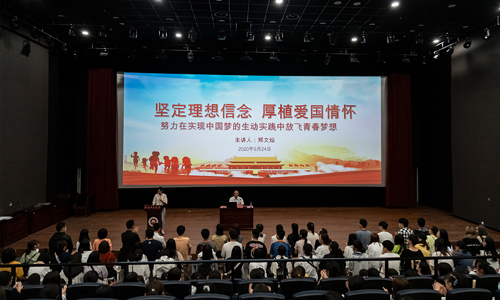 9月24日,传播学院在星雨剧场开展2020级新生“爱国主义理想信念”入学集中教育活动。院党委书记郑文灿为新生作题为《坚定理想信念 厚植家国情怀——努力在实现中国梦的生动实践中放飞青春梦想》的讲座。370名新生聆听报告。
