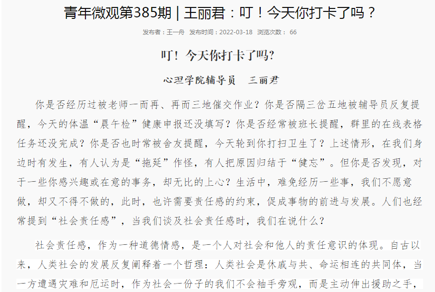 弘扬抗疫精神。3月以来,学生工作部通过微博、微信及易班、小联等平台,在“青年微观”栏目推送由师生撰写的疫情防控与爱国主义教育等主题文章215篇次,阅读量达10万余次;强化学生党员、学生干部带头遵守疫情防控规定,带头维护校园秩序,积极参加志愿服务,关心帮助身边同学,积极传播正能量。通报表扬一批343名积极参与各地联防联控工作的优秀青年学生,凝聚广大青年学生共同抗疫,让党旗在抗疫一线高高飘扬