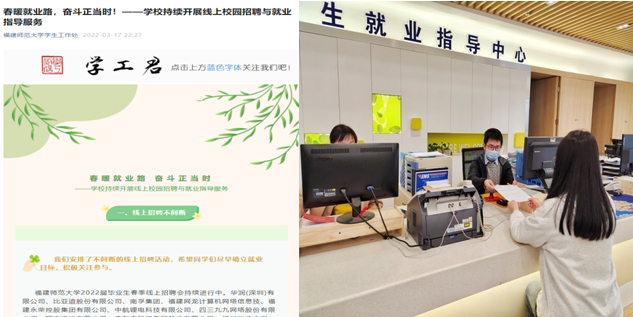 持续就业帮扶。持续开展“春暖就业路,奋斗正当时”线上校园招聘与就业指导系列活动。通过就业指导中心网站、微信公众号、就业工作群等多种渠道,及时分类发布就业相关资讯,搭建好毕业生与用人单位之间的信息互通桥梁,开辟“师范生专区”,开展“师范生专项供需互联季”活动。依托教育部“24365”平台、省级“云招聘”平台、学校智慧就业平台等举办各类线上招聘活动,举办2022届毕业生春季线上招聘会,助力毕业生线上求职。开放视频面试间,供毕业生免费使用,服务毕业生线上面试需求。举办2022年春季“空中就业课堂”公益培训,采用线上直播等方式,开展省级公务员考试、教师招聘考试、基层就业等系列指导活动,为毕业生提供就业“云教育”服务。