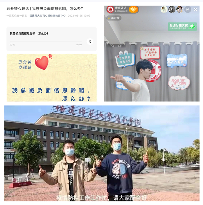 为缓解疫情期间学生的焦虑情绪,各系辅导员纷纷使出奇招妙计。管理学系汪武志、孙雅琪等辅导员组织学生拍摄疫情防控宣传视频,通过视频号在朋友圈等不间断播放,用接地气的方式让战疫宣传更暖心;经济与法学系团委书记、2021级辅导员翁振淞独辟蹊径,带着学生做起了说唱,将中国风融入说唱,以全员抗疫为主题,告诉学生们有梦就要追;外语系团委书记、2020级辅导员姚强组织学生干部,为学子们开设了多场直播小课堂,请来系里健身经验丰富的同学,线上教授宿舍运动技巧;直播学霸学习过程,交流学习方法,直播如何做手磨咖啡冲泡、美甲,丰富学生课余生活。