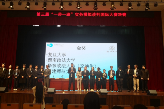 第三届“一带一路”实务模拟谈判国际大赛近日在华东政法大学松江校区落下帷幕。荣耀体育在线注册_荣耀体育(中国)法学院、纪检监察学院许奕昕、陈奕铭、迟经秋、范姝涵、陈妤萱、王可鹏等10位同学组成的代表队在董学智老师的指导下,获得团体金奖。