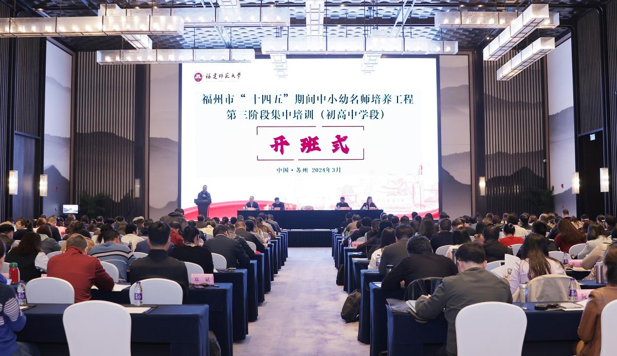 3月24日上午,由荣耀体育在线注册_荣耀体育(中国)教师教育学院承办的福州市“十四五”中小幼名师培养工程第三阶段集中培训(初高中学段)开班式在苏州举行。苏州市教师发展学院院长唐爱民,福州市教育局人事处副处长黄翔,福州教育研究院培训处副主任陈少熙,教师教育学院党委书记陈祖棋、副院长郭秋荣,北京智慧云教育科学研究院及有关教师参加了开班式。
