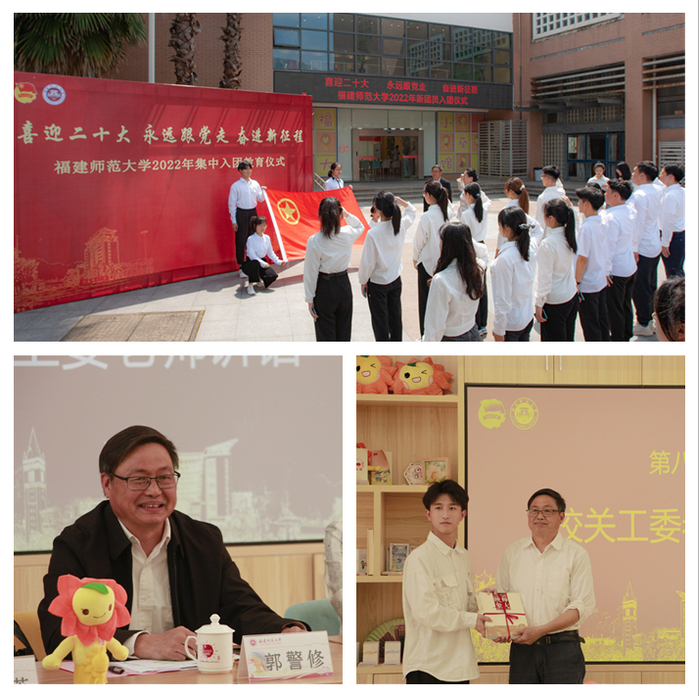 戴少娟宣读了新团员名单,与会老师为新团员颁发团员证、佩戴团徽,新团员代表在团旗前庄严宣誓。光电与信息工程学院2021级朱宇凌,2021年福建省优秀共青团员、经济学院2019级韦卓翔分别代表新老团员发言。