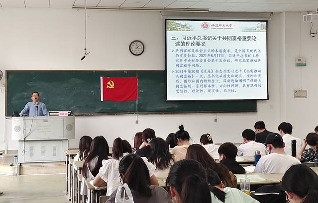 曾盛聪主讲《学习习近平总书记关于共同富裕的重要论述》。他紧扣“共同富裕的理论基础与源泉”“当代中国的共享发展”“习近平总书记关于共同富裕的重要论述的理论要义”“共同富裕的实践课题”“共同富裕与当代青年责任”等五个方面,引经据典、深入浅出、全面系统地阐述了习近平总书记关于共同富裕的重要论述。