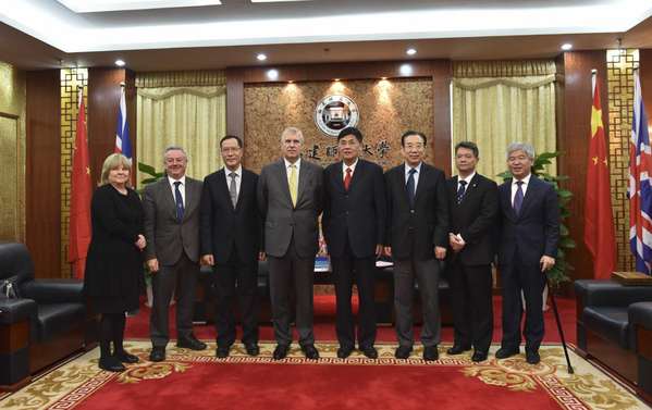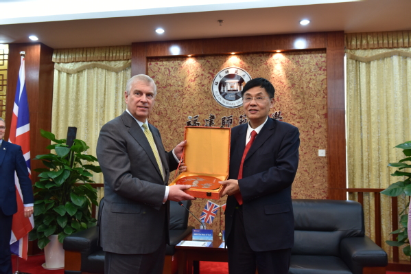 On the afternoon of April 16th, His Royal Highness Prince Andrew The Duke of York, accompanied by Mr. Wu Hailong, President of the Chinese People’s Institute of Foreign Affairs (CPIFA) visited Fujian Normal University and met with FNU’s senior staff-members. Also present at the meeting included Mrs. Amanda Thirsk, Private Secretary to the Duke, Prof. Bob Cryan, Vice Chancellor of the University of Huddersfield (UoH), Prof. Lynn Dobbs, Vice Chancellor of London Metropolitan University (London Met), Ms. Karen Maddock, Consul General of the British Consulate General in Guangzhou, James Norman, Consul of the British Consulate General in Guangzhou, Mr. Liu Lian, Deputy Director of the European Department of CPIFA, Mr. Chen Chuxin, Vice Chair of the Chinese People's Association for Friendship with Foreign Countries of Fujian BranchMr. Li Baoyin, Chair of the FNU Council, Prof. Wang Changping, President of FNU, and Prof. Lai Hairong, Vice President of FNU.
