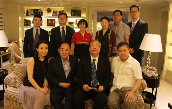 Visiting Dr. Lucio Tan (sixth from left, front row), leader of overseas Chinese in the Philippines, Permanent Honorary Chairman of the Federation of Filipino-Chinese Chambers of Commerce and Industry, Inc. (FFCCCII), board chairman of Philippine Airlines and board chairman of Chiang Kai Shek College