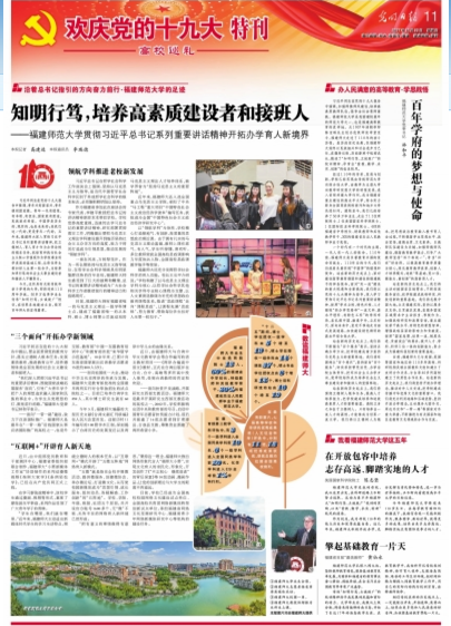 Since mid-Autumn this year, Guangming Daily has launched a series of subject reports on 19th CPC Congress. Before 19th CPC Congress, Diligent and Courageous Five Years, Welcome the 19th CPC Congress Special Issues, reported 51 notable universities in its special editions, including Peking University and Peking Normal University. After the opening of the Congress, Celebrate 19th CPC Congress Special Issues, a tour around Colleges and Universities, reported five more schools, Tsinghua University and FNU included. Till now, in Fujian only Xiamen University and FNU have been focused on in an special edition in this series of reports.
