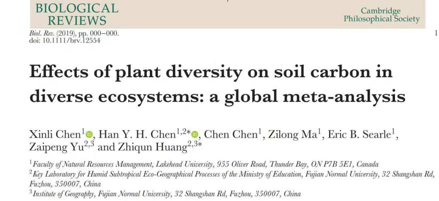 The research group of forest plant diversity and soil biological processes of School of Geographical Sciences, Fujian Normal University has made significant progress in the study of the relationship between plant diversity and soil organic carbon. And their related results were published in Biological Reviews, a top journal of biology, in the form of the paper, titled Effects of plant diversity on soil carbon in diverse ecosystems: a global meta-analysis. (2019, DOI: 10.1111/brv.12554) (impact factor, IF=10.288).