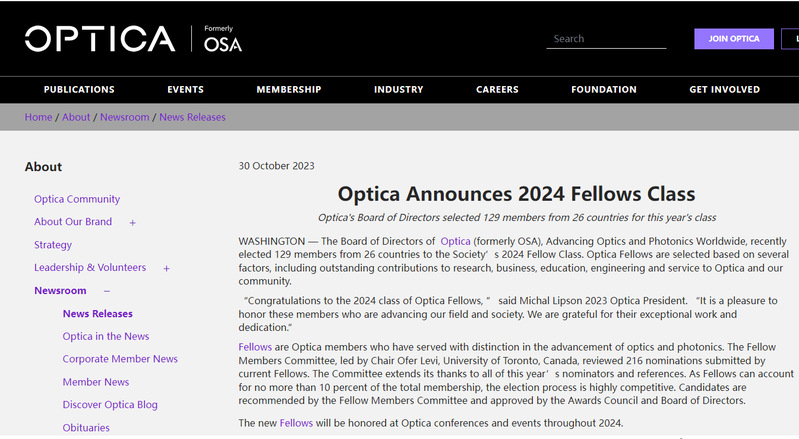 Official announcement link: https://www.optica.org/about/newsroom/news_releases/2023/october/optica_announces_2024_fellows_class/
