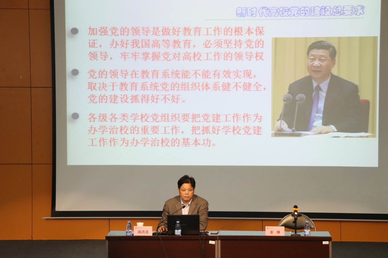 开幕式后,省教育工委组织处处长陈洪尧教授为大家作题为“新时代高校党支部建设的实践与思考”的专题讲座,对学院党建工作特别是党支部建设给予了理论与实践双重指导。